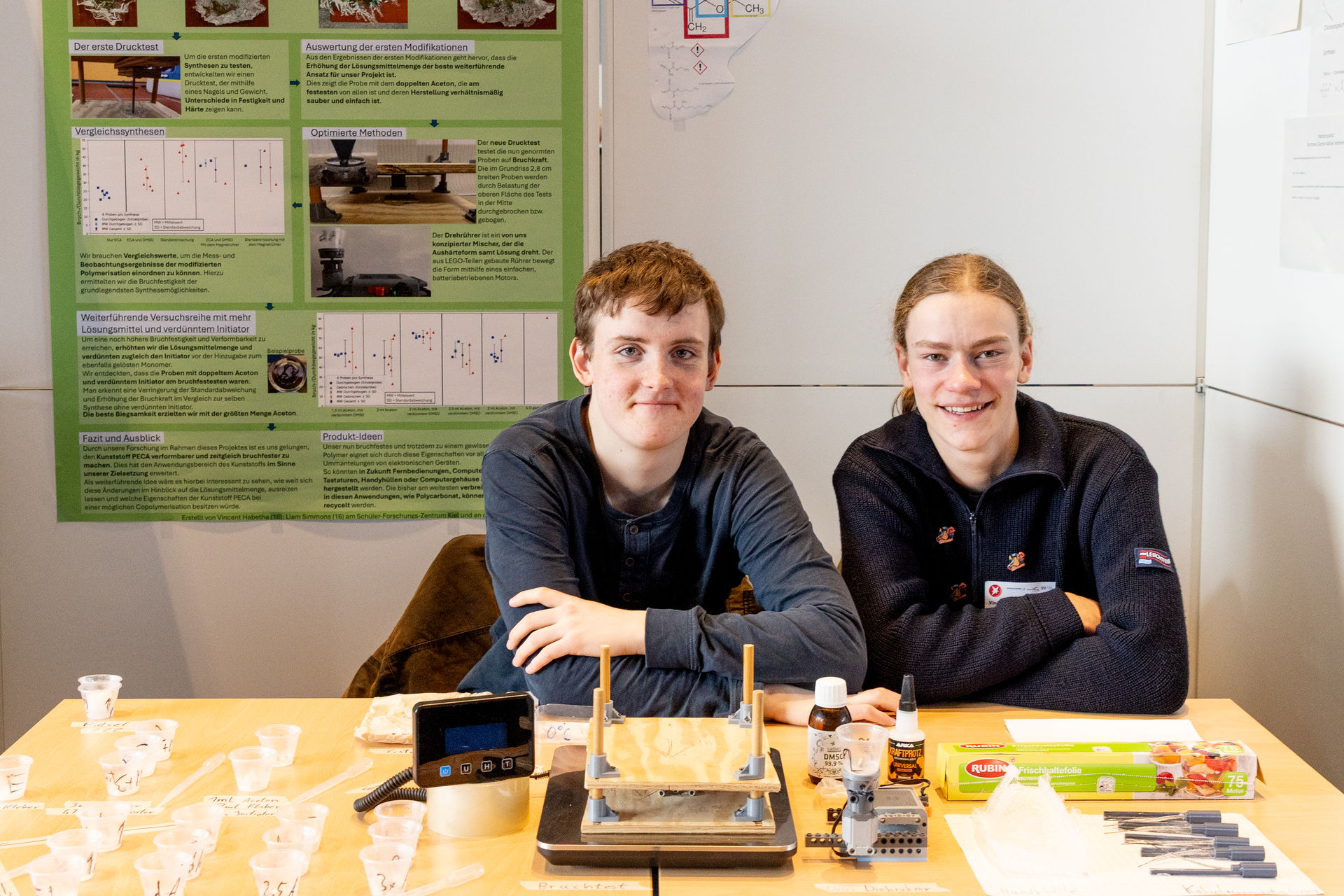 Die 16-jährigen Vincent Habetha und Liam Simmons erhielten im Themengebiet Chemie bei Jugend Forscht den ersten Preis. In ihrem Projekt setzen sich die beiden Jugendlichen mit der Polymerisation des Kunststoffs Polyethylcyanacrylat auseinander, dessen Monomer Ethylcyanacrylat (ECA) ein Hauptbestandteil von handelsüblichem Sekundenkleber ist. Ihre Vermutung ist, dass sie die Produkteigenschaften durch Anpassung des Lösungsmittelanteils beeinflussen können und sich aus ihren Ergebnissen mögliche konventionelle Anwendungen, wie beispielsweise Verpackungen, aber auch spezifische Nutzungspotenziale ableiten lassen.