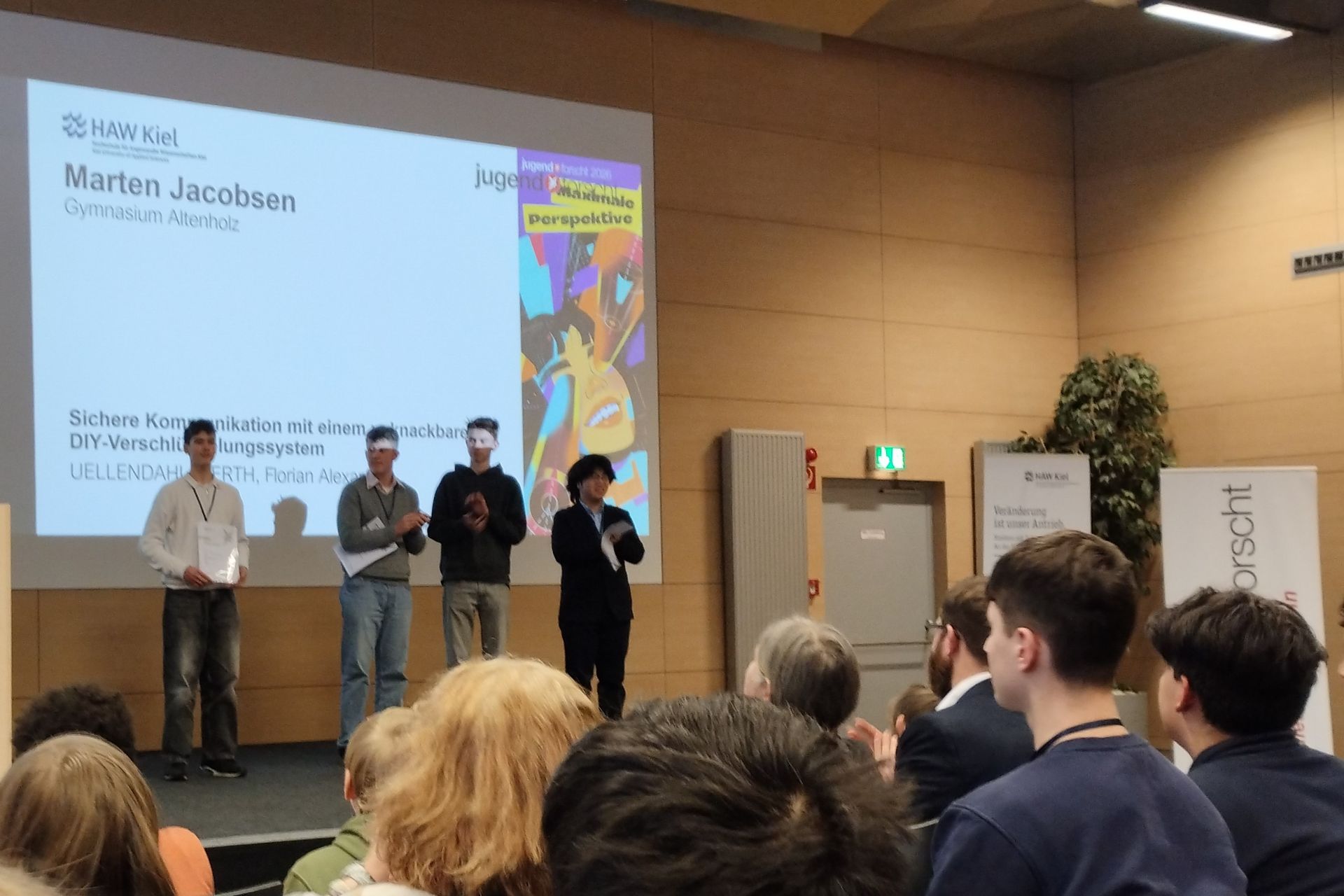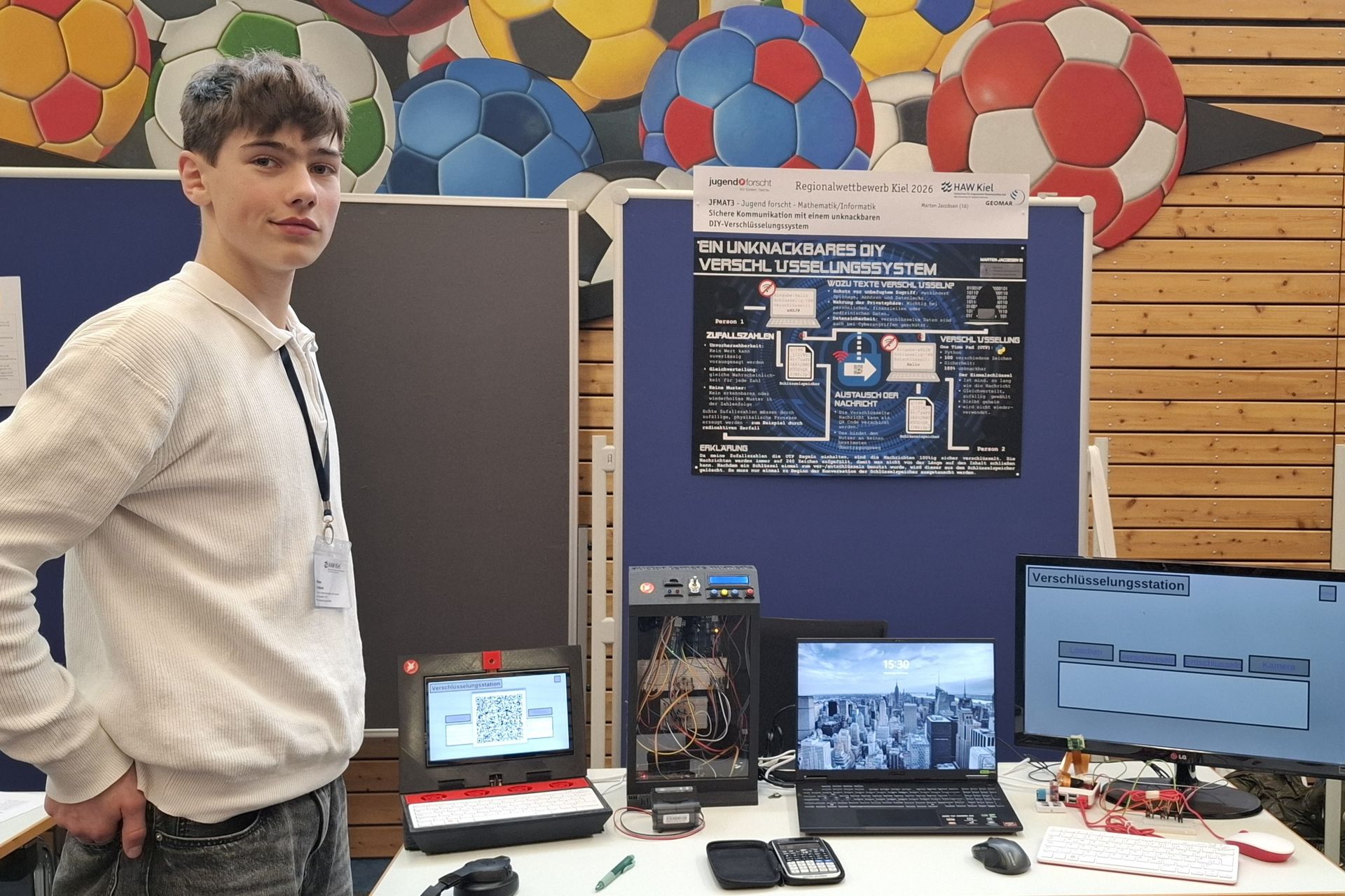 Der erste Preis bei Jugend Forscht im Themengebiet Mathematik/Informatik ging in Kiel an Marten Jacobsen (16 Jahre). Er entwickelt im Rahmen seines Projektes ein Verfahren zur Erzeugung von Zufallszahlen aus verschiedenen physikalischen Messungen. Mit diesen Zahlen möchte er Nachrichten so verschlüsseln, dass ein sehr hoher Grad an Sicherheit erreicht wird. Für die Umsetzung nutzt er verschiedene selbstgebaute Komponenten wie Zufallszahlengeneratoren und Chiffriergeräte. Das Verfahren für den Transport der Nachrichten soll für die Nutzer*innen komfortabel sein und beispielsweise mit dem Smartphone funktionieren.