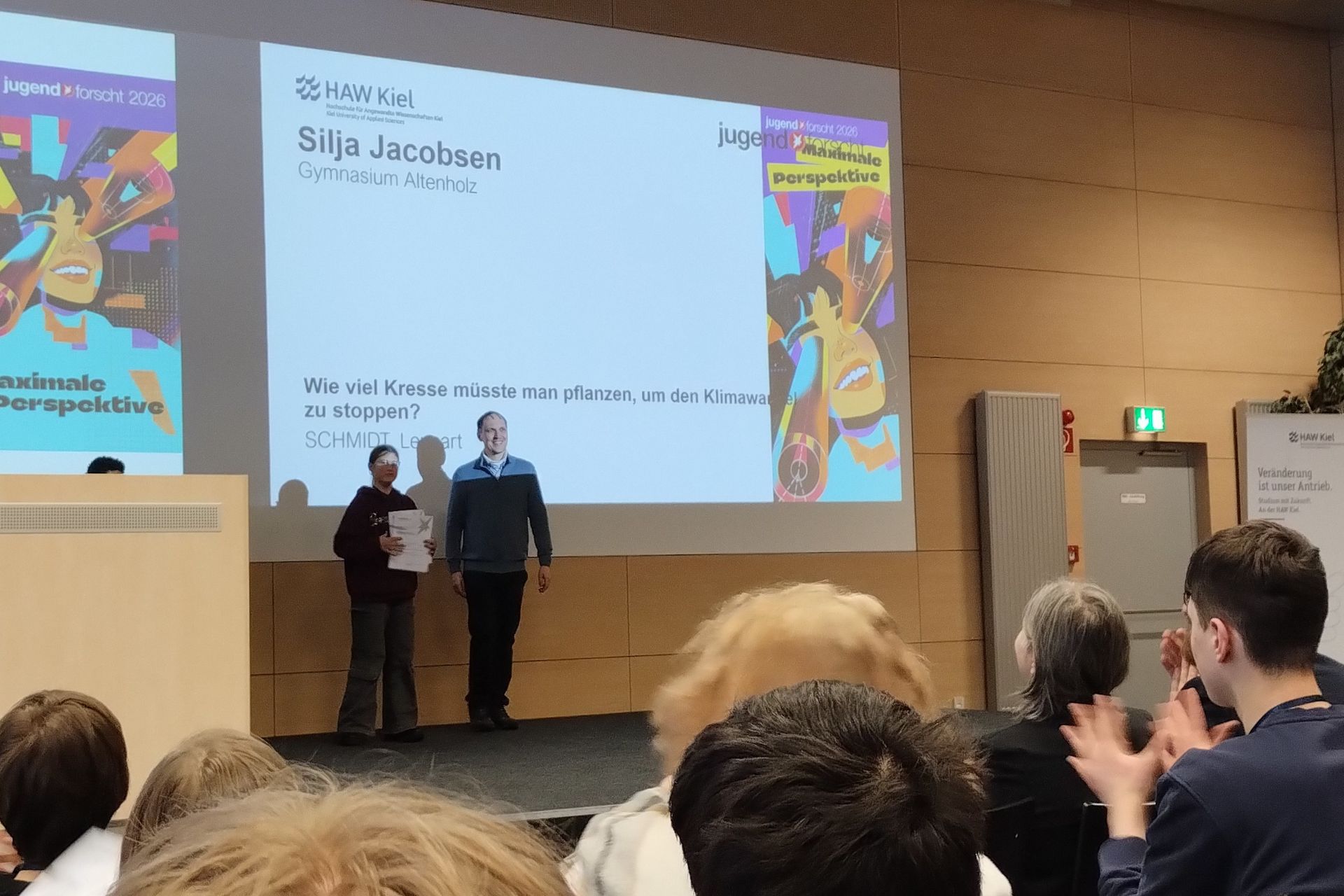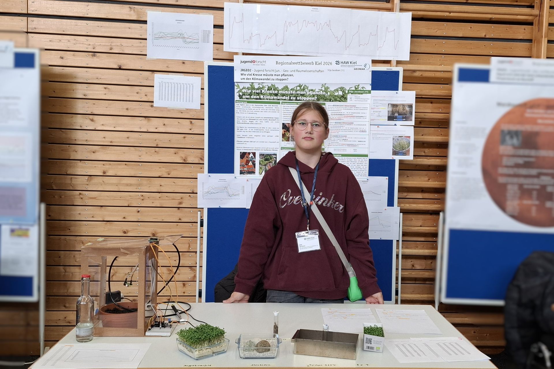 Beim Regionalwettbewerb in Kiel am 18. Februar freute sich die 11-jährige Silja Jacobsen über den ersten Preis bei Jugend Forscht junior im Themengebiet Geo- und Raumwissenschaften. Sie beschäftigte sich mit der Frage, wieviel Kresse wir pflanzen müssten, um den Klimawandel zu stoppen. In einem Versuch ließ sie Kresse wachsen und nutzte dann einen Sensor, um herauszufinden, wie viel Kohlenstoffdioxid (CO₂) diese aufnimmt. Mit diesem Ansatz möchte sie ausrechnen, was wir theoretisch tun müssten, um den bisherigen Einfluss der Menschen rückgängig zu machen und wie viele Pflanzen wir bräuchten, um wieder einen guten CO₂-Wert zu haben.