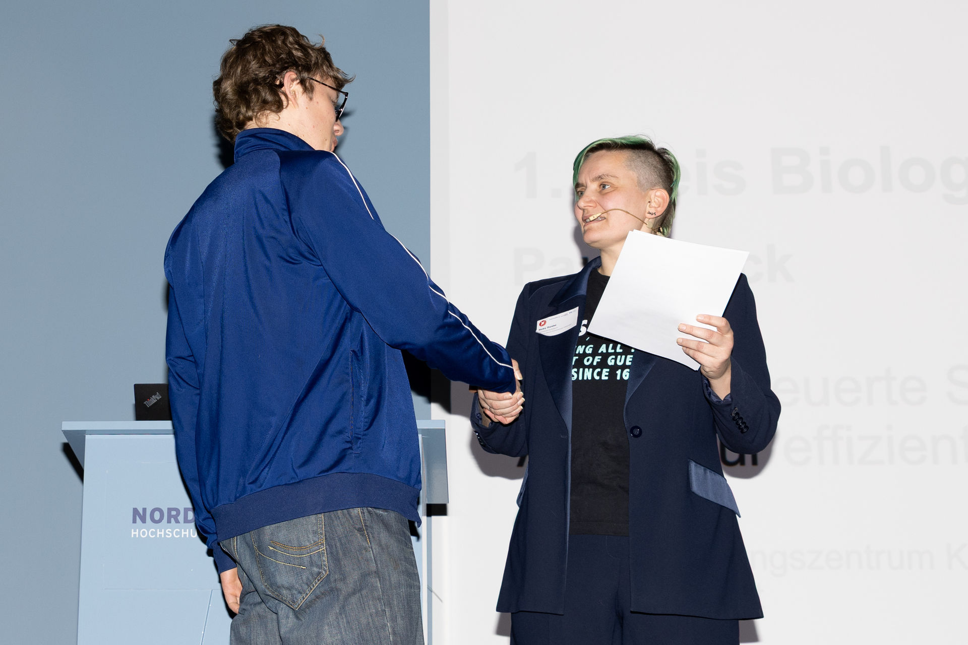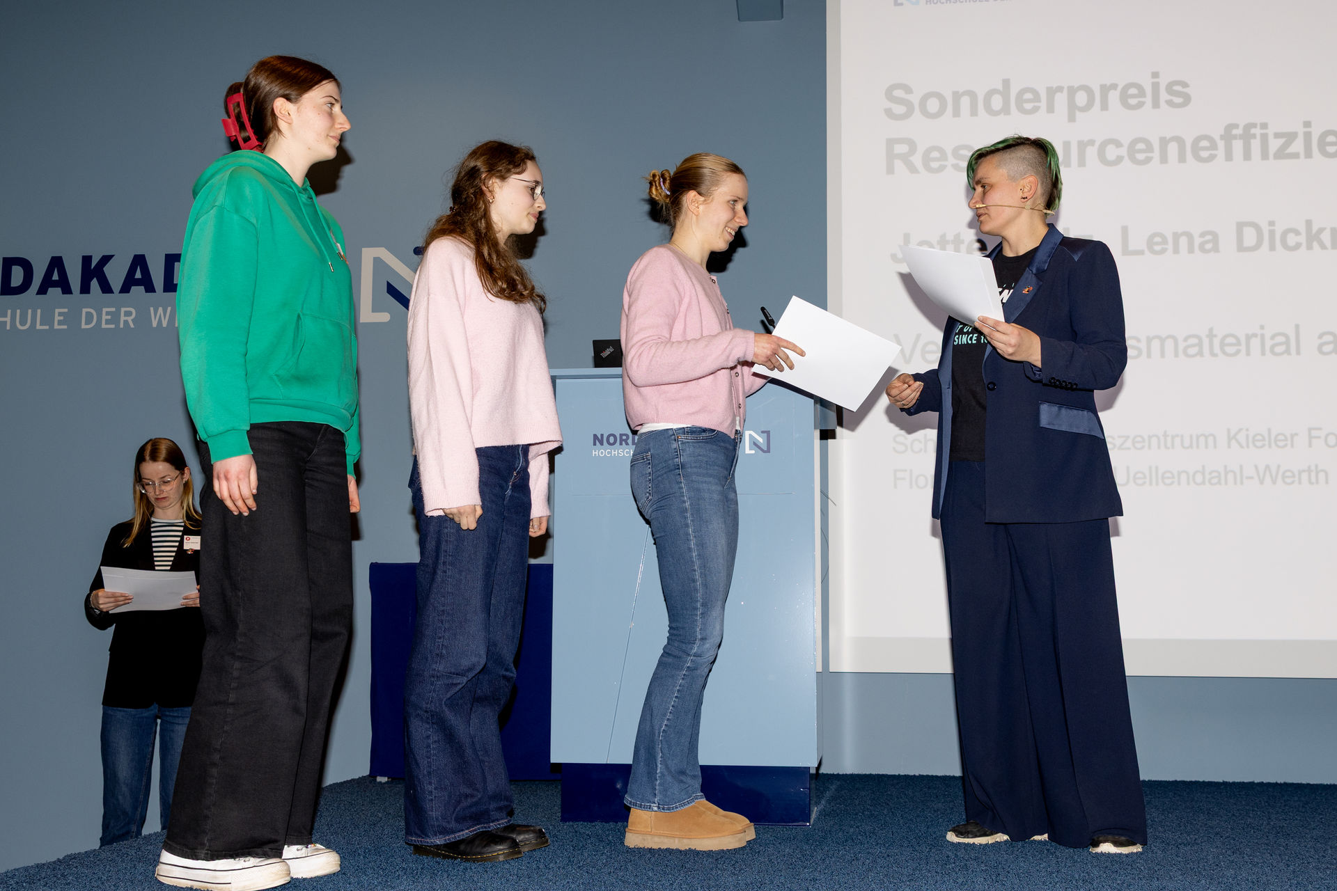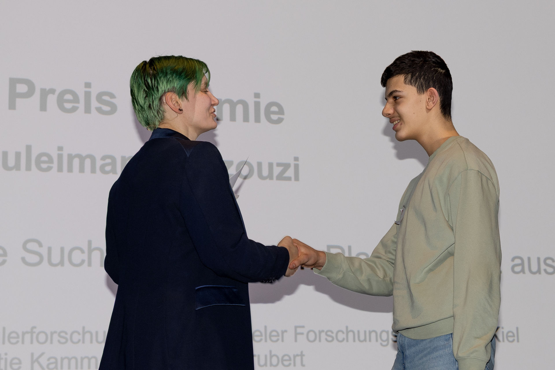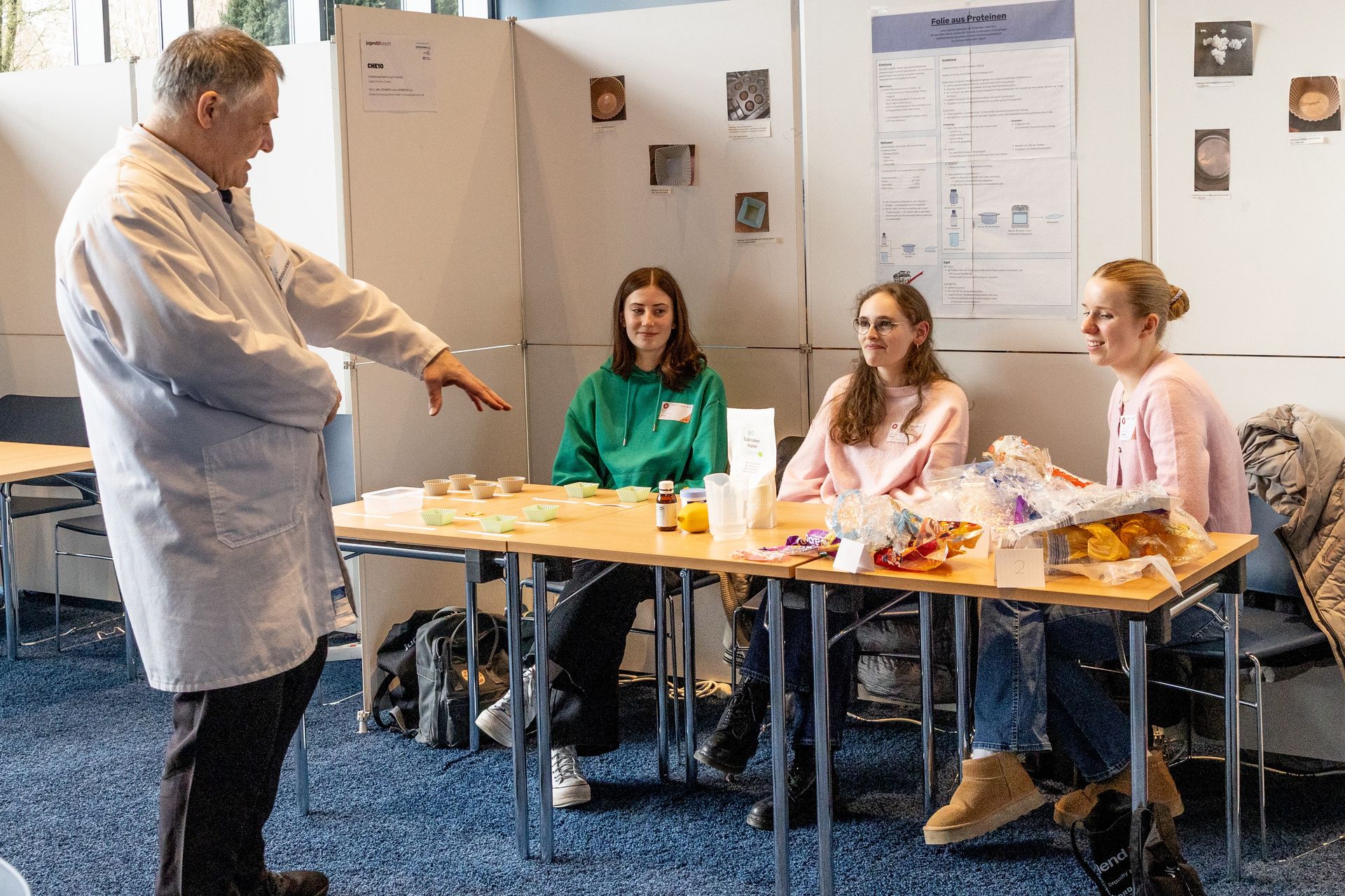 Ebenfalls in Elmshorn gingen Jette, Lena und Lia an den Start. Die drei Jugendlichen hatten sich während der TalenteCamps der MINT-Akademie in der Kieler Forschungswerkstatt kennengelernt und freuten sich bei Jugend Forscht im Fachgebiet Chemie über den Sonderpreis „Ressourceneffizienz und Zirkularität“. Gemeinsam arbeiteten sie über verschiedene Standorte hinweg daran, ein Verpackungsmaterial aus Proteinen herzustellen, um so Ressourcen wie Erdöl einzusparen.