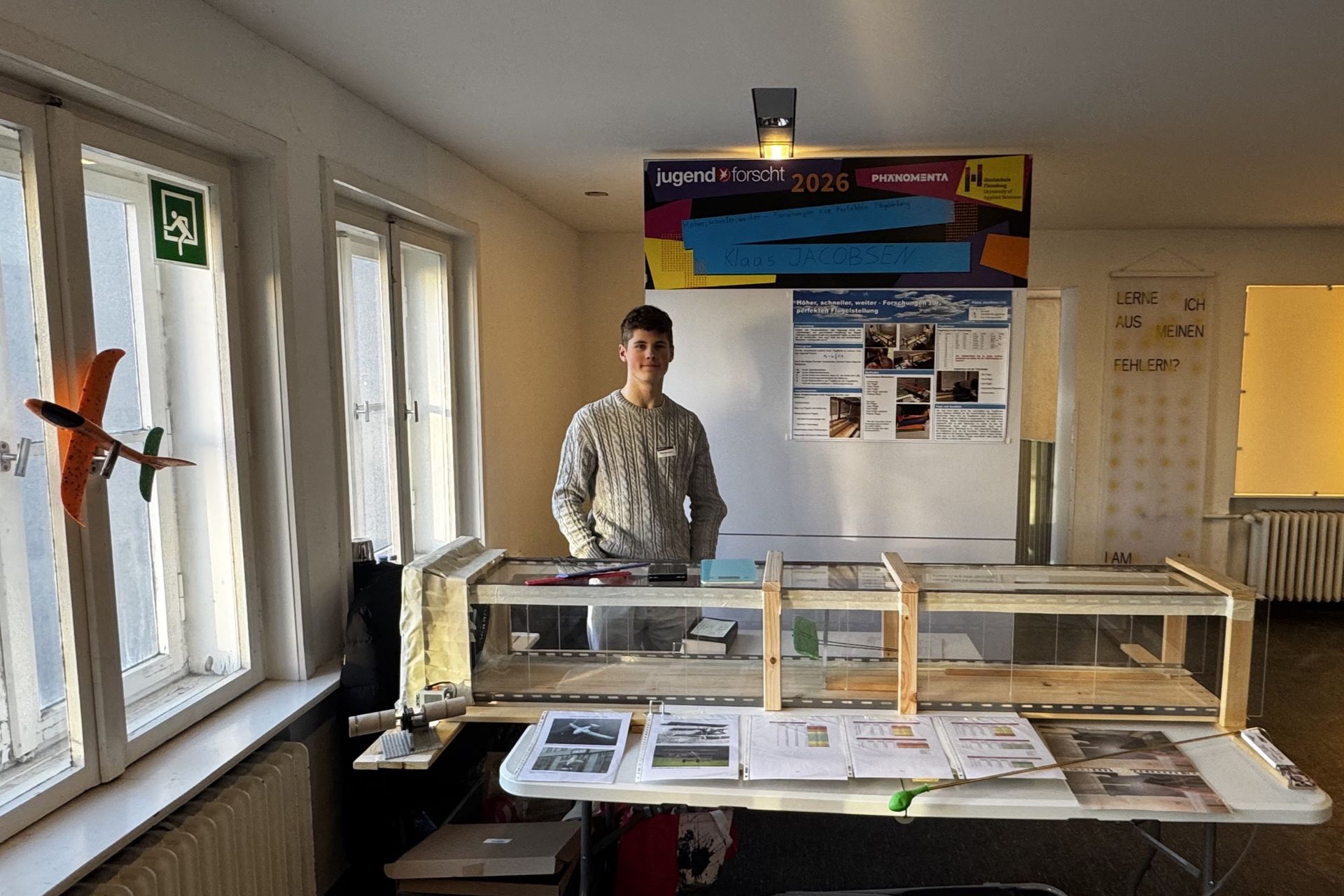 In Flensburg fand am 5. März der letzte der insgesamt fünf schleswig-holsteinischen Regionalwettbewerbe statt. Der 14-jährige Klaas Jacobsen erreichte hier bei Jugend forscht junior im Themengebiet Physik den zweiten Platz. In seinem Projekt untersuchte er, wie eine Optimierung von Flügelform und -stellung möglich ist, damit sich die Luftströmungen nicht gegenseitig behindern oder ausbremsen. Dazu hat er in einem kleinen selbst gebauten Windkanal verschiedene Flügelstellungen und deren Auftrieb gemessen. Sein Ziel war es, Verbesserungsmöglichkeiten für den Flugzeug- und Drohnenbau zu finden und so durch eventuelle Einsparungen bei Treibstoff oder Baumaterialien auch einen Beitrag zum Umweltschutz zu leisten.